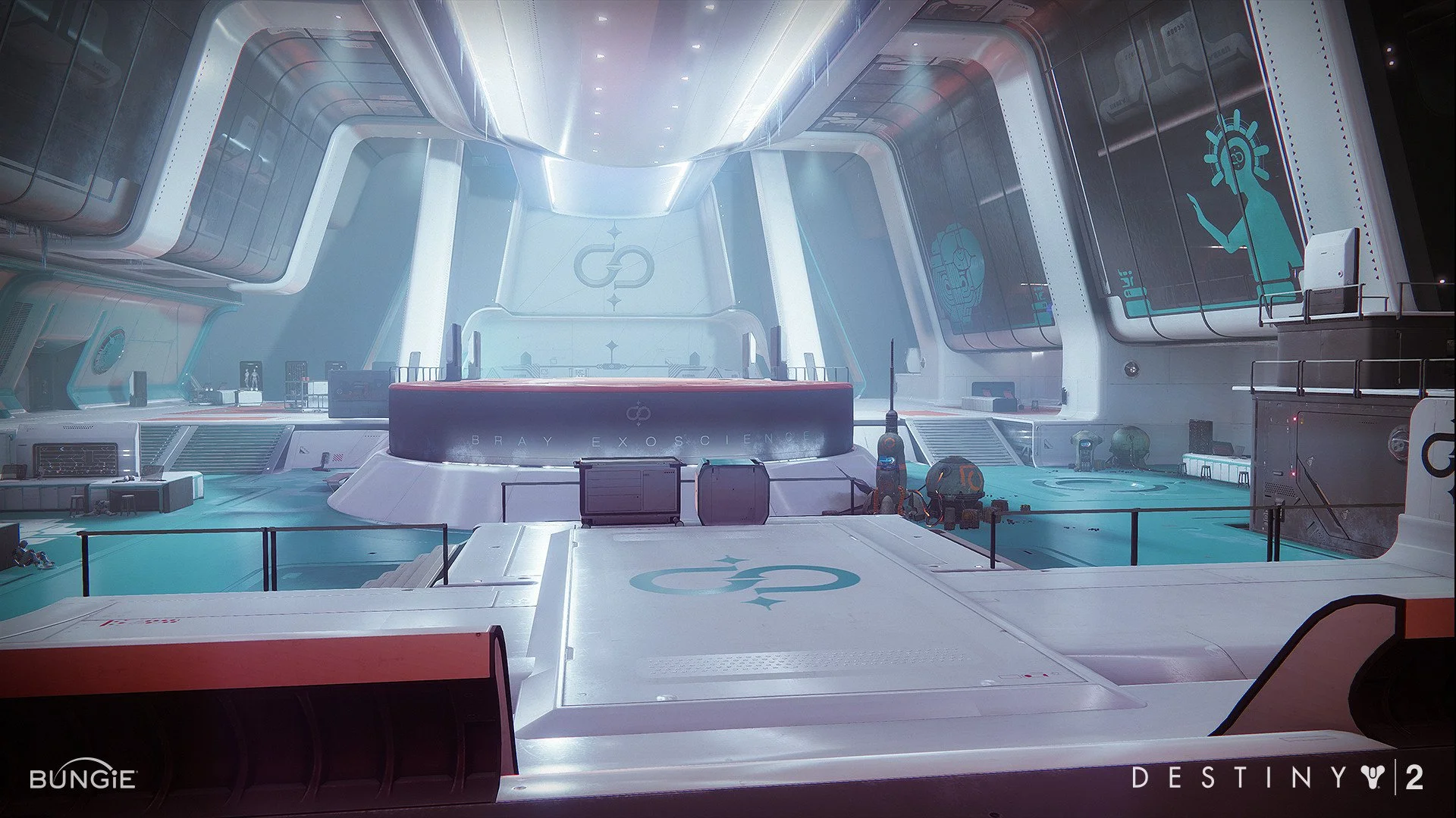 The grand lobby of the Bray Exoscience complex, which was a shared space for multiple activities. For my mission, we used this space for a multi-wave encounter built around a bipedal mech, who starts on the central raised platform. Because of its size, we needed to make sure all of the paths around and through the space were a bit wider than average while also maintaining a solid density of cover objects.