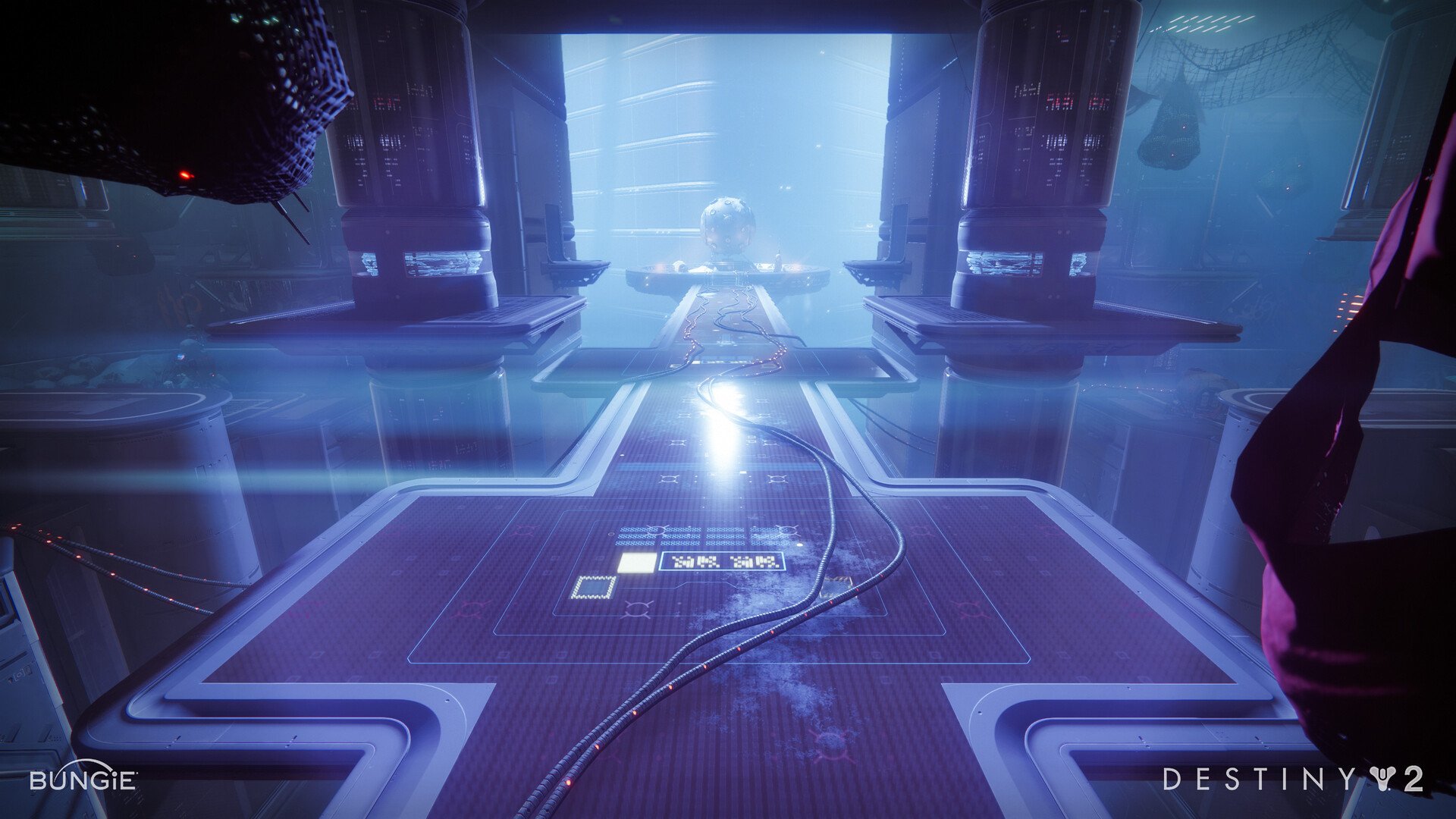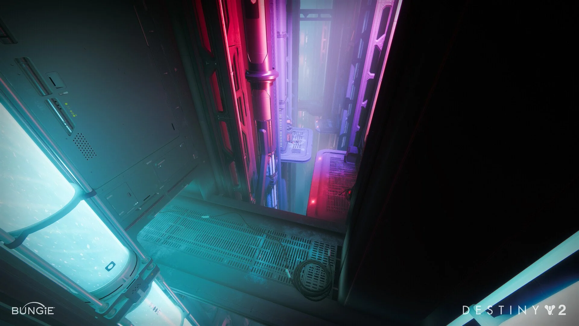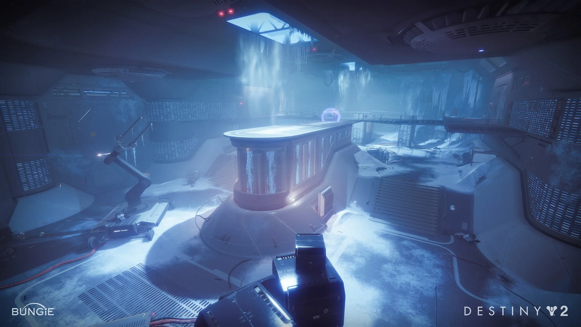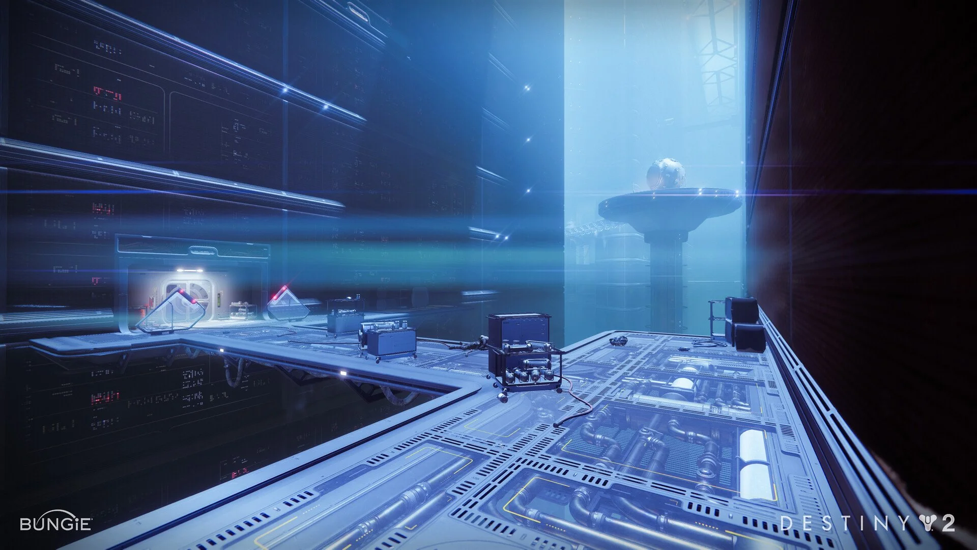 Leaning into the “cavernous tech” theme again for this space, we wanted to include a minor traversal challenge for players as they try to reach the highest platform here, in the foreground. During the mission, each platform is defended by a sniper so we made sure to include enough room out of sight to the sides for players to use as cover once they reached each platform.